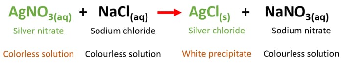 White precipitate or new substance is formed. NaCl AgNO 3 à NaNO 3 AgCl The formulas of the products are obtained by switching the ions A white precipitate is produced when these solutions are mixed. This is intended as an introductory activity involving the concept of dynamic equilibrium.